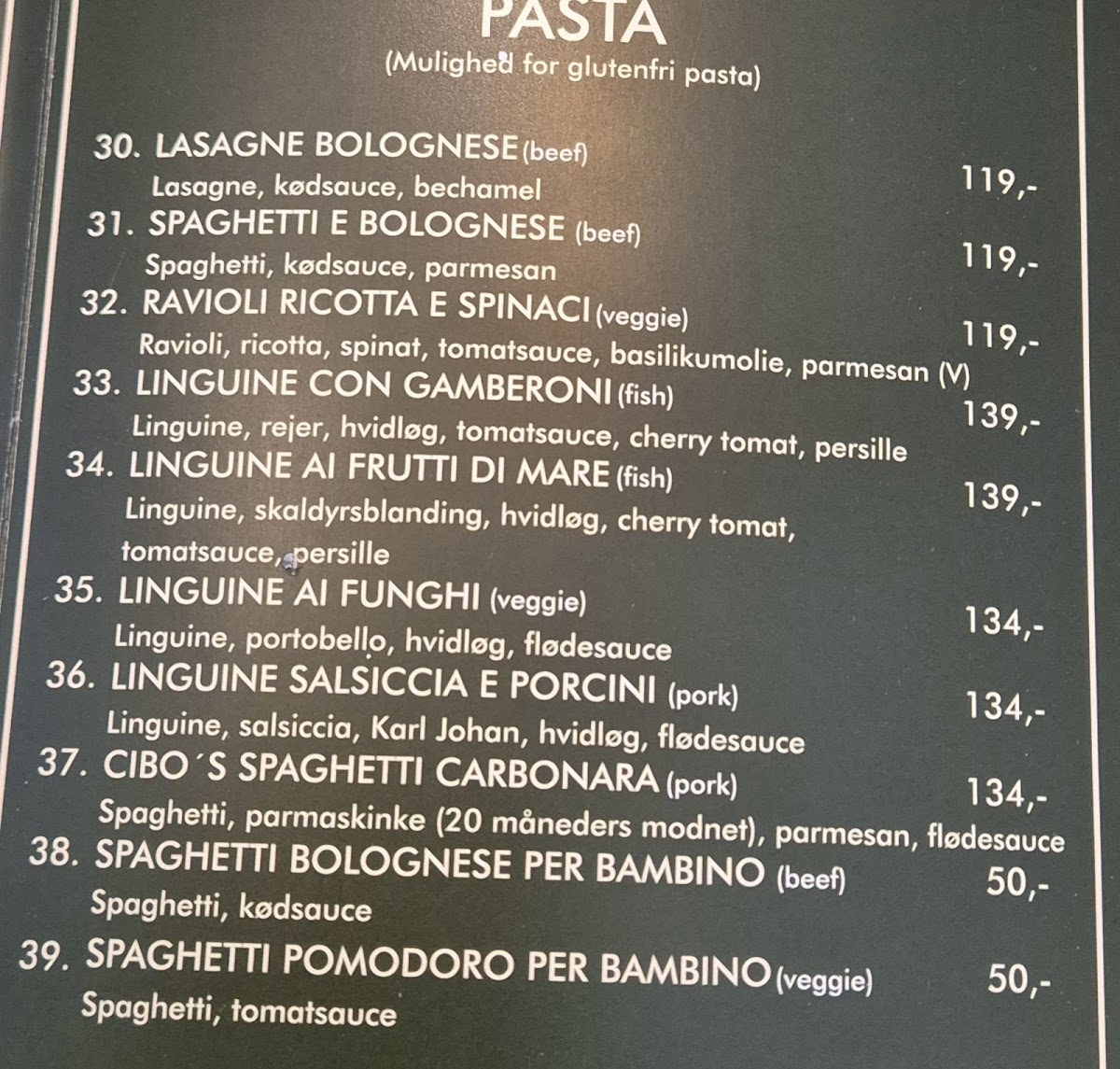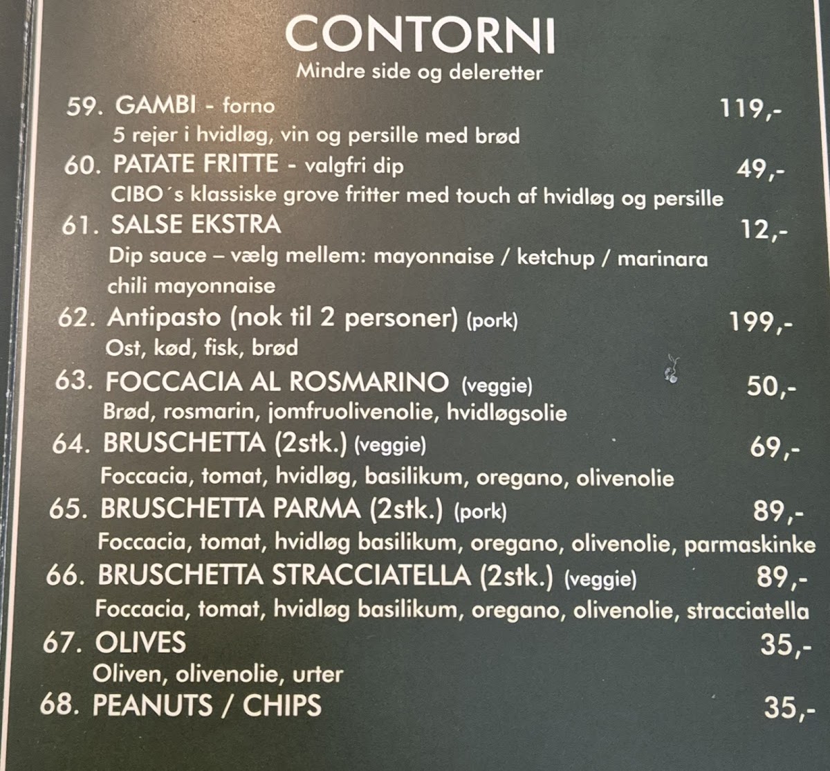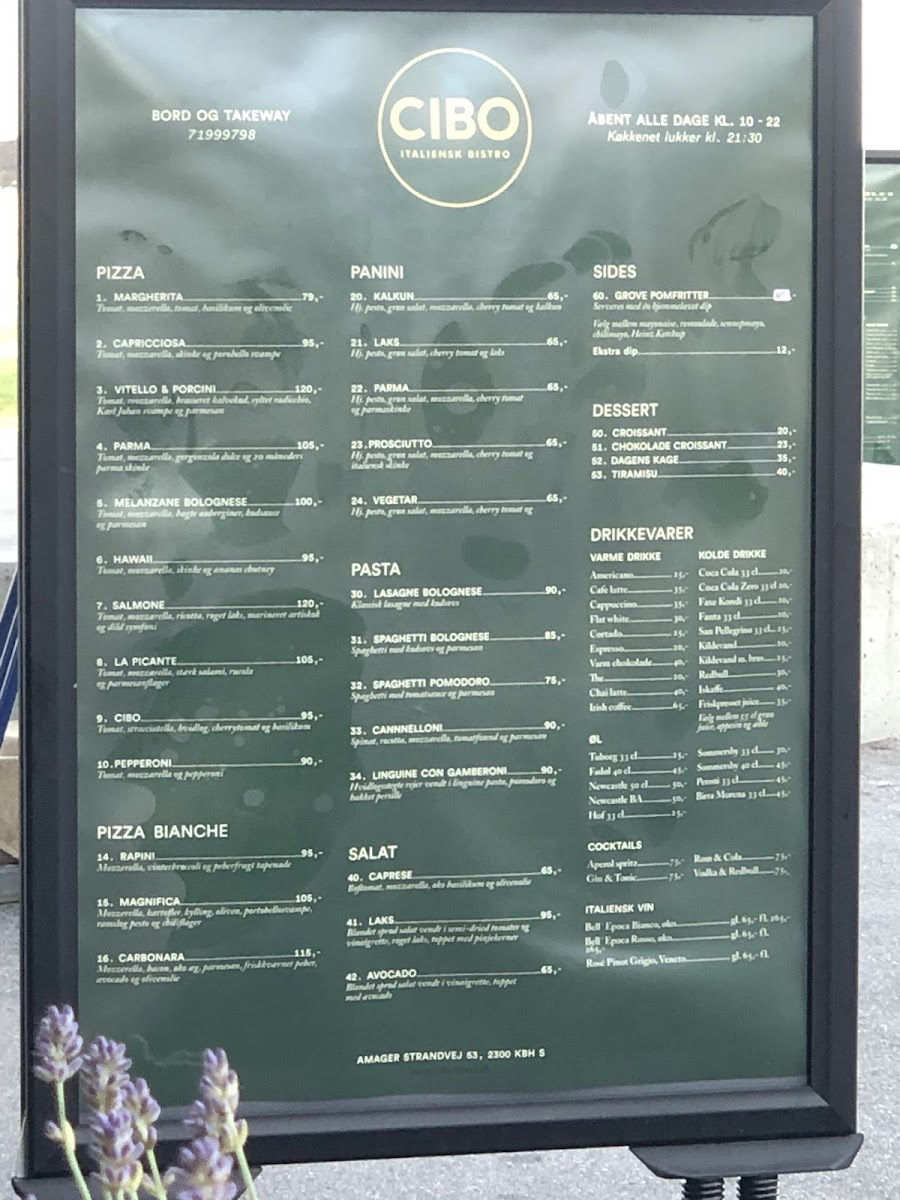The menu at Cibo Copenhagen offers a delightful variety of classic Italian dishes, making it a great spot for both casual and indulgent meals. For starters, their drinks selection is diverse, featuring options like Øl and Aperol, both of which pair perfectly with the meal choices. The Fadøl Og Cola is also a popular drink combo for those who prefer something refreshing alongside their meal.